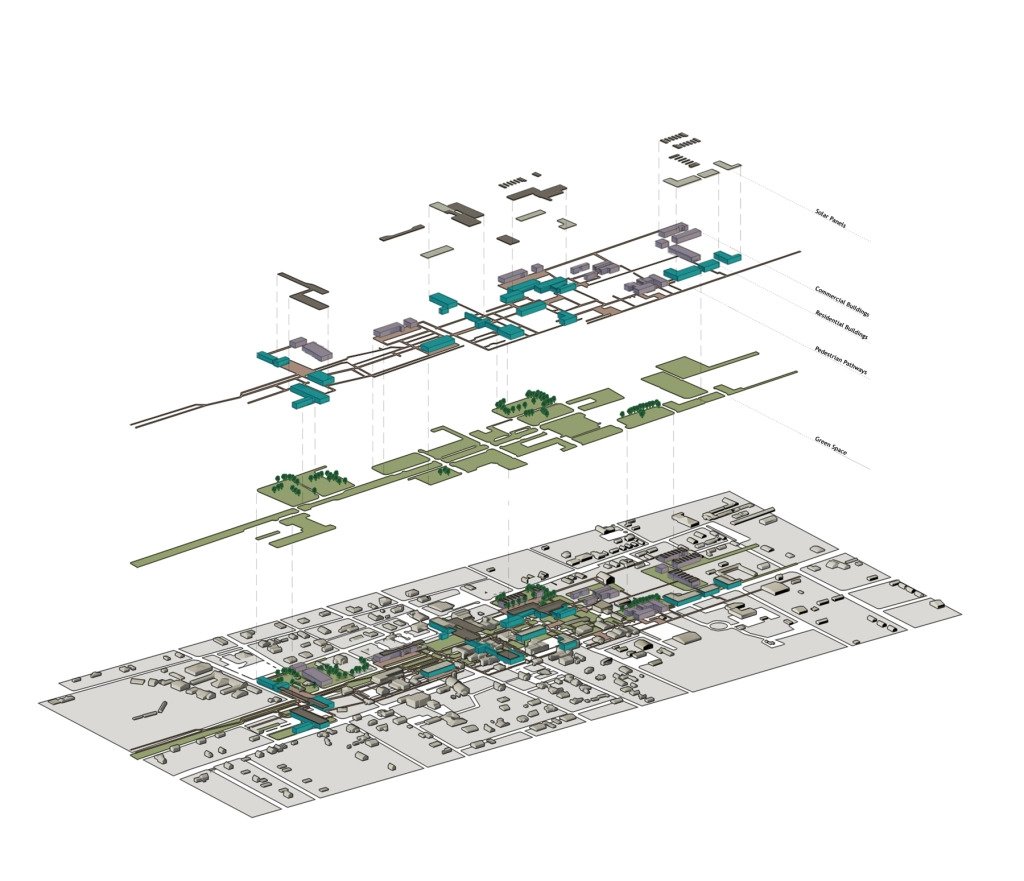 As an infrastructure, the system is completely expandable and able to accommodate both private and public investments. Green space is layered with the Photovoltaic elements as a system of PV canopy, tree canopy, hardscape, greenscape, and wetscape. Existing natural areas are connected to the core through a system of parallel linear parks, with adjacent row houses, low rise, and mid-rise housing.
