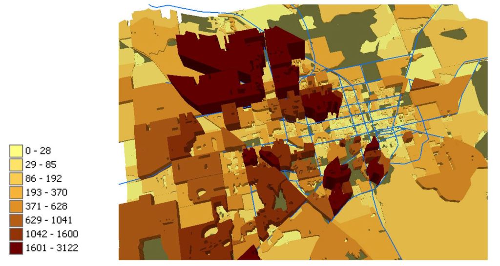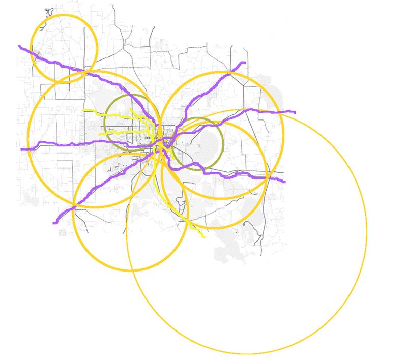 Considering population concentrations conjoined with the linear structure of destination distribution, linkages could be made that leverage existing infrastructure rather than propose new routes. Much of the population lives within 5 miles of the core (UF) and significant portions are within 3 miles. Based on our surveys (discussed in the Public Disposition Section) people would ride on average 25 minutes through well-designed infrastructure – an equivalent distance of 4+ miles.