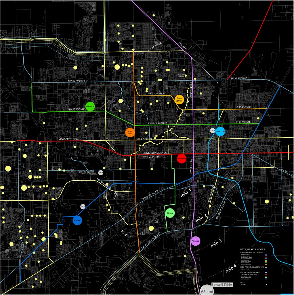 Project conceptualization was required to develop appropriate strategies and protocols appropriate to the scales of context that bicycles encounter in the Alachua County region. Nets, Braids, and Loop rationalizes these environments to simplify recommendations and to recognize the benefits that are in place and in some cases, not yet utilized.
