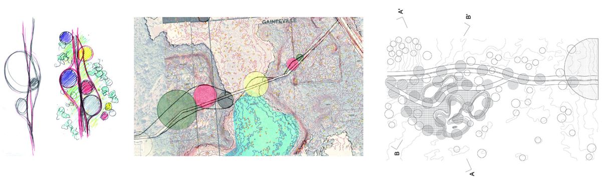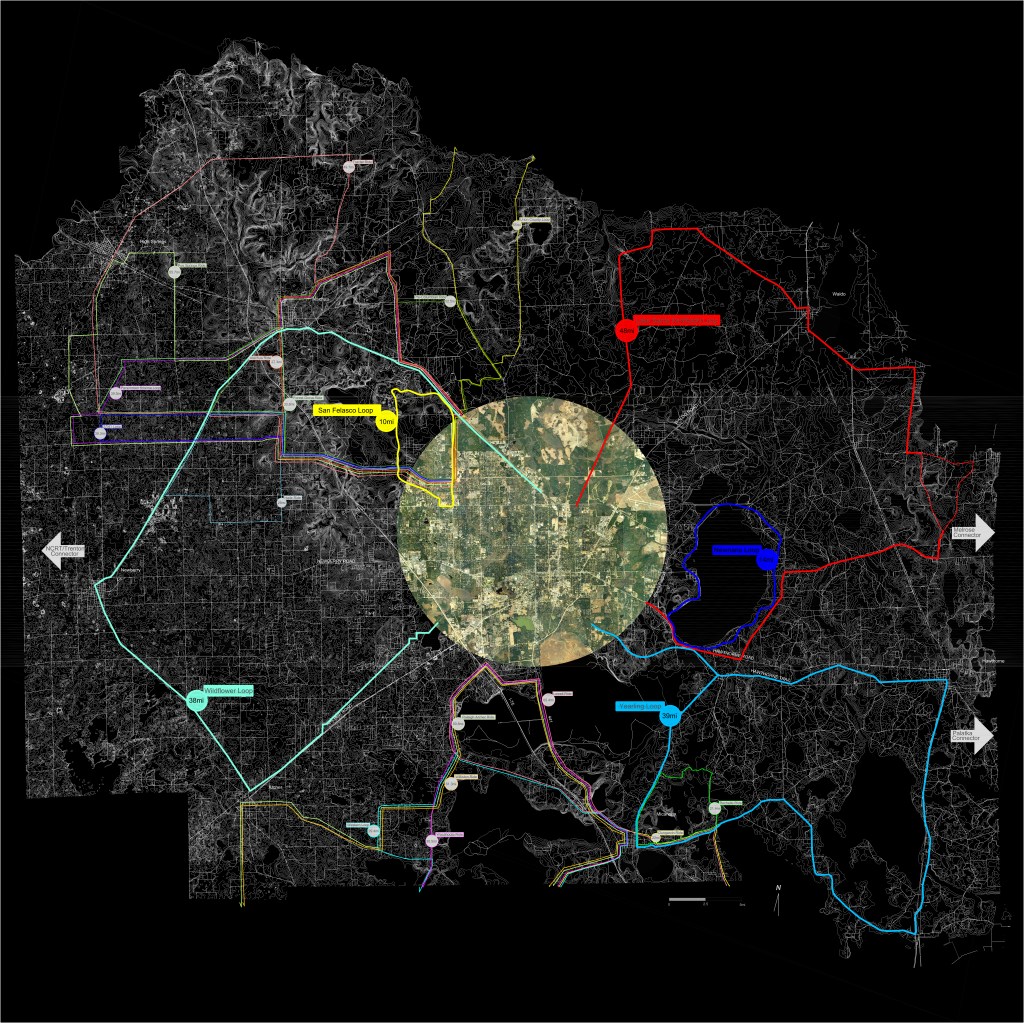 Transporting Ecologies engages design to integrate infrastructural, social, civic, public health, natural, technological, and economic priorities that are typically parsed into solipsistic command and control bureaucracies. Innovative and emergent strategies for urban, suburban, and rural conditions, both proposed and applied, are developed through case study research, observation, analysis, and representation that mediate landscape, transportation infrastructure, and architecture to cultivate civic space in Alachua County. Nets, Braids & Loops conceptualizes modal scales of the neighborhood, arterial connector, and rural routes to organize investment priorities, design protocols, and intervention strategies to transition from policies of segmentation to interconnection.