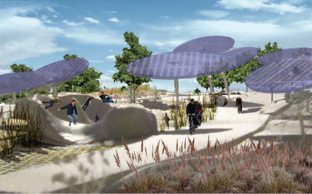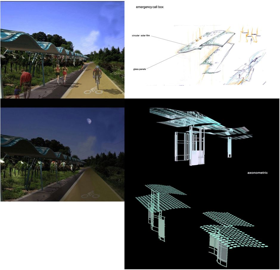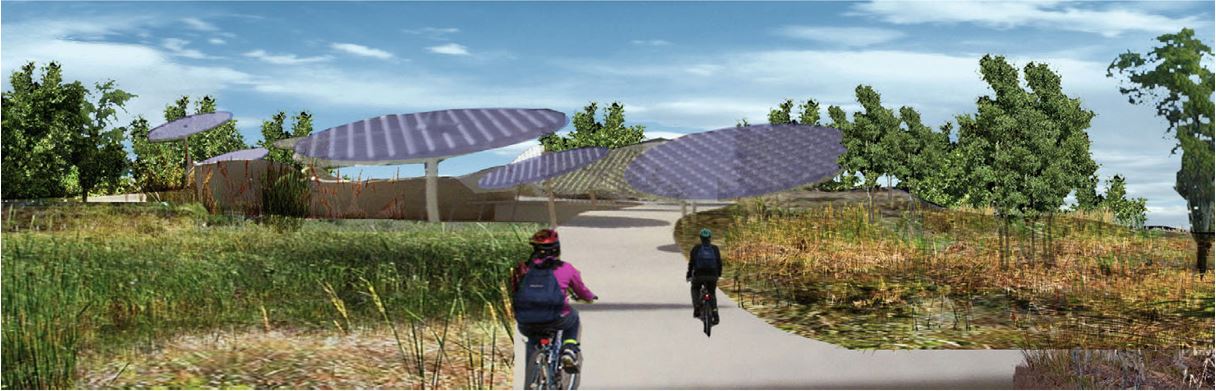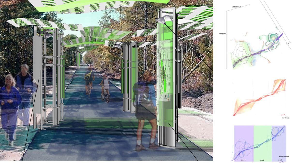 The Solar Garden optimized the use of photovoltaic devices to provide energy to the community while shading the trail. The promotion of ecology and health is supported through kiosks and rest pavilions along the rail. Kiosks might monitor health (heart rate) or other indicators and/or monitor energy generation. Stopping is promoted as a destination encouraging communal interaction.