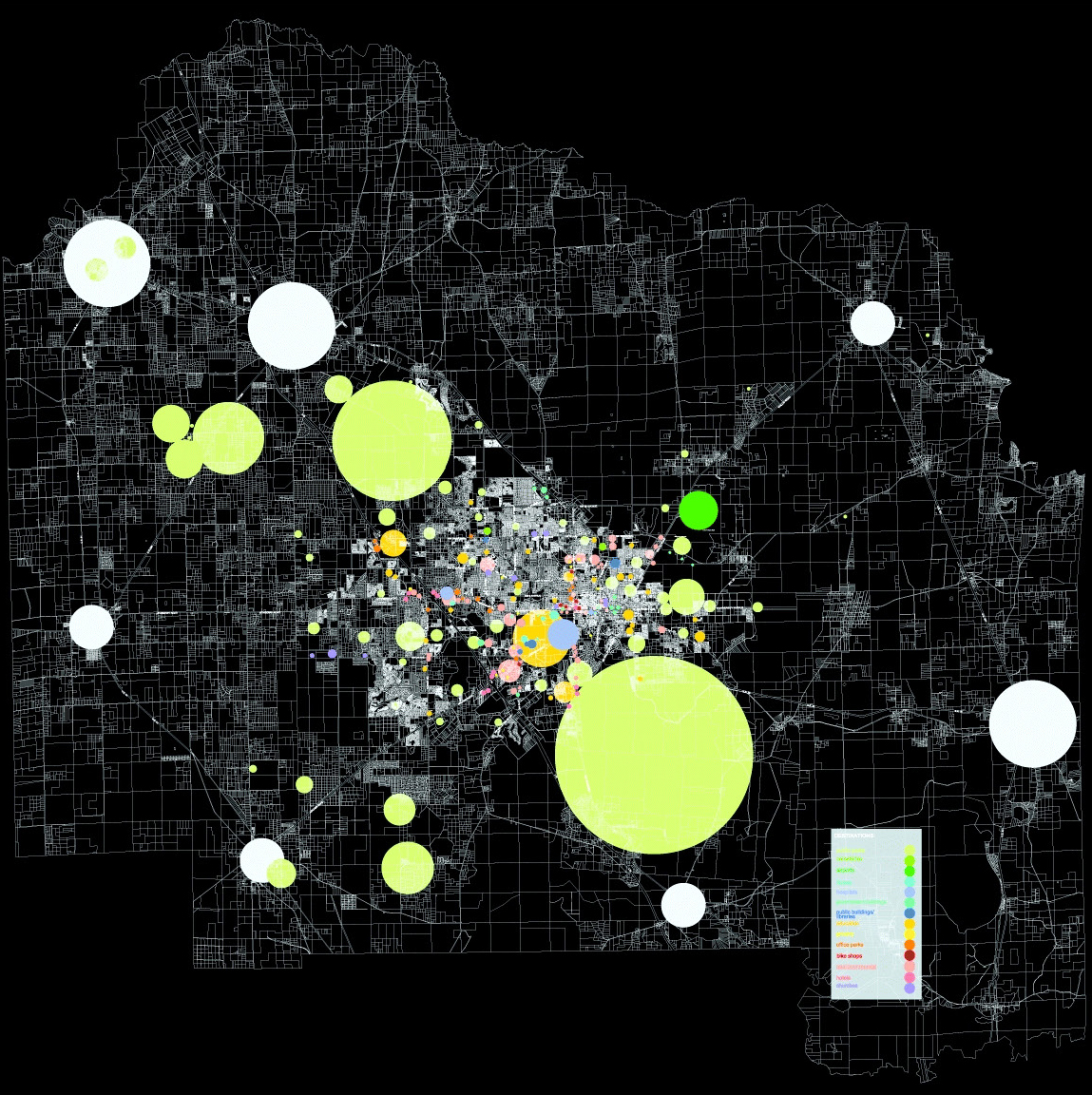 Nets characterize the street grid system and networks of neighborhood streets that organize most housing and in the case of the downtown commercial and public locations as well. This infrastructure is suitable as-is in most locations providing alternate bicycle routes and typically good connectivity.