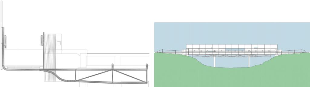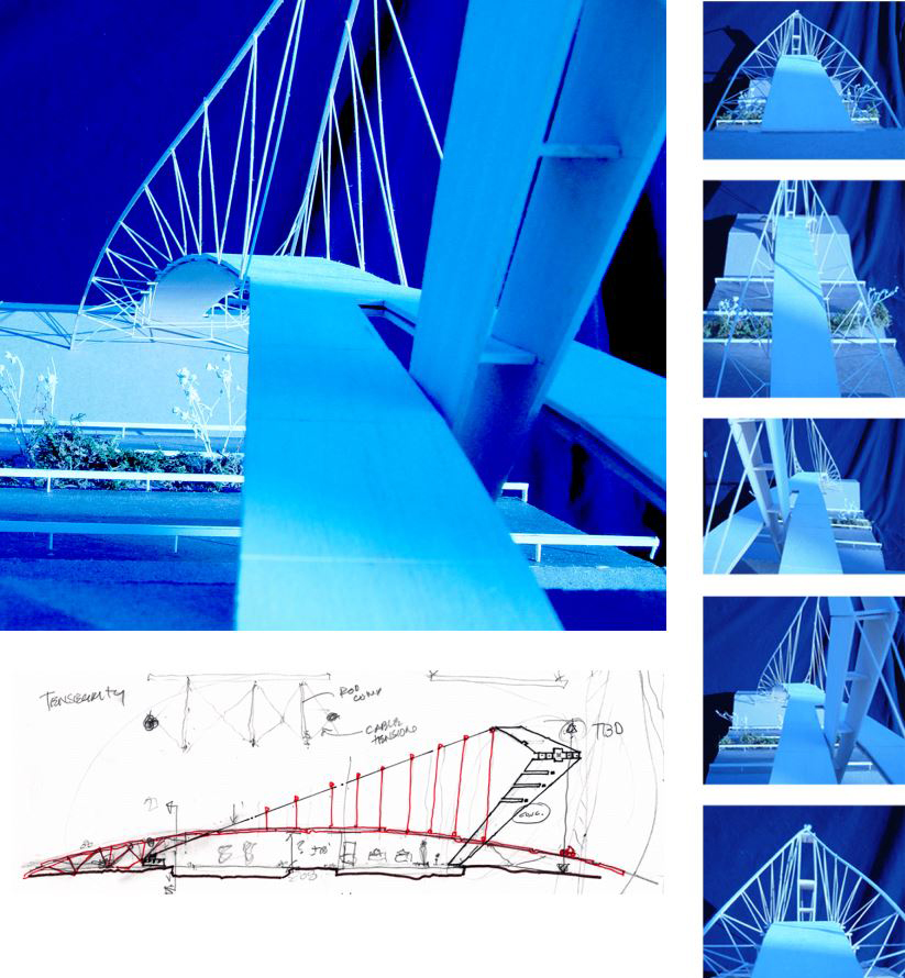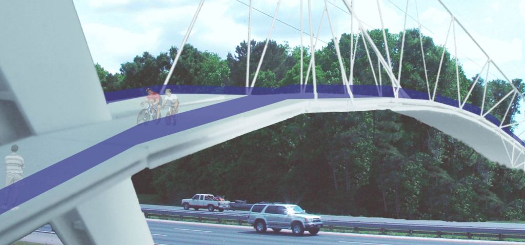 A bicycle-pedestrian bridge is proposed to connect west Gainesville across Interstate 75. The bold and innovative tensegrity structure integrates high-efficiency structural design minimizes materials and engenders a visually open and dynamic structure — establishing Gainesville as an important location on the national interstate highway system. Protection for automobiles and safety rails will be included as a visually transparent system such as a web mesh (not shown) to maintain the open feel.