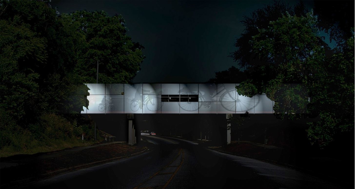 Cycle screen utilizes the cycling movement to activate the NW 13th Street overpass at NW 8th Avenue — currently a cycle and pedestrian hostile zone. The adaptation of shadow screen tectonics portrays various scales of cycle and pedestrians crossing the bridge. Separated cycle paths are provided to connect cycle lanes across the narrow bridge. Cycle pedestrian links to NW 8th Avenue below are provided that integrate stormwater catchments and vegetation to define circulation paths and public space.