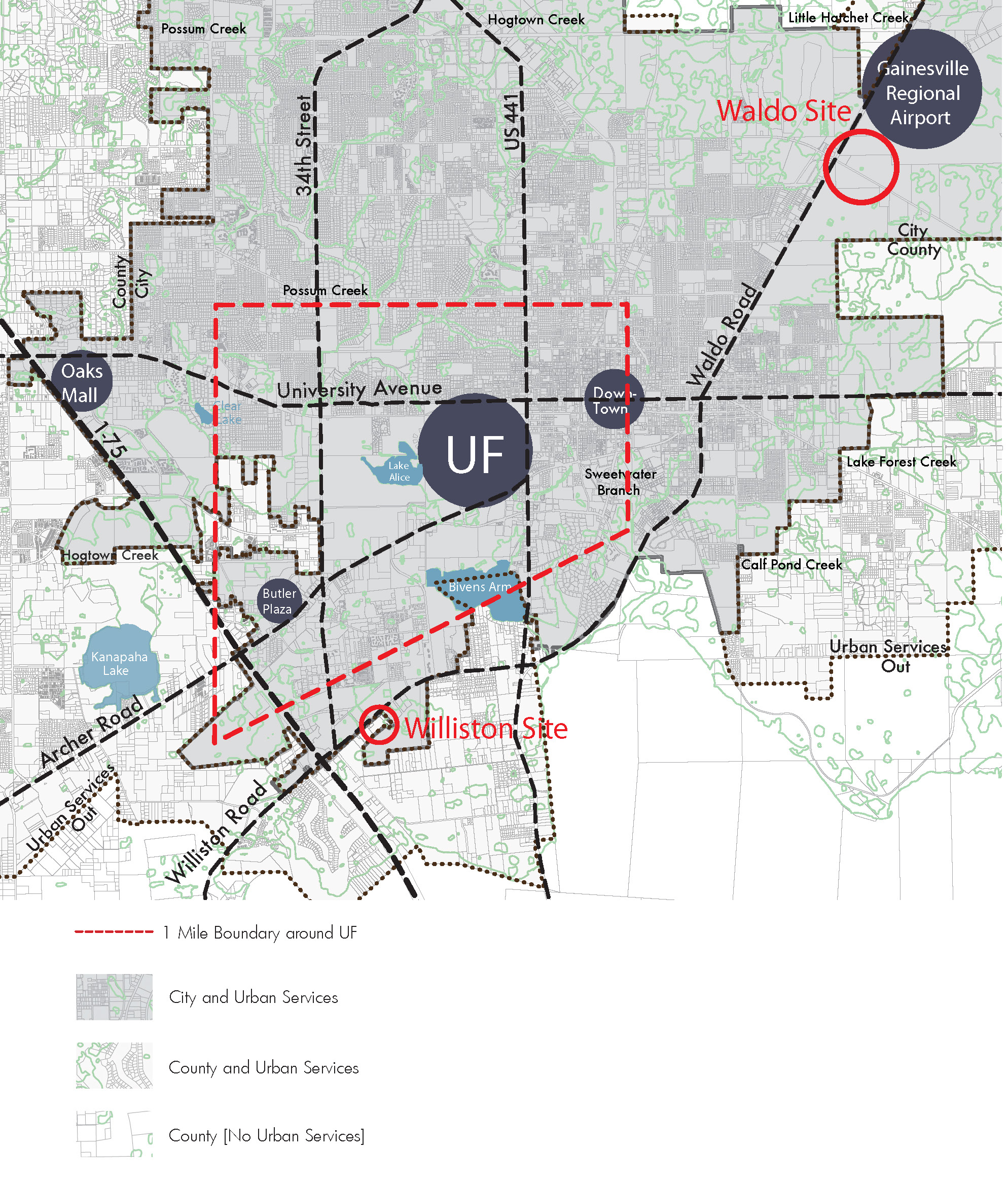 The ‘Old Fairgrounds Site’ (currently still the fairgrounds) on the corner of Waldo Road and NE 39th Avenue was selected as it is in the process of being designated as Business Industrial land use which would be appropriate for a mixed-use office park and it is strategically placed in terms of multi-modal transportation connections. It is in a sensitive ecological area as a primary watershed to Newnan’s Lake — a degraded water body.