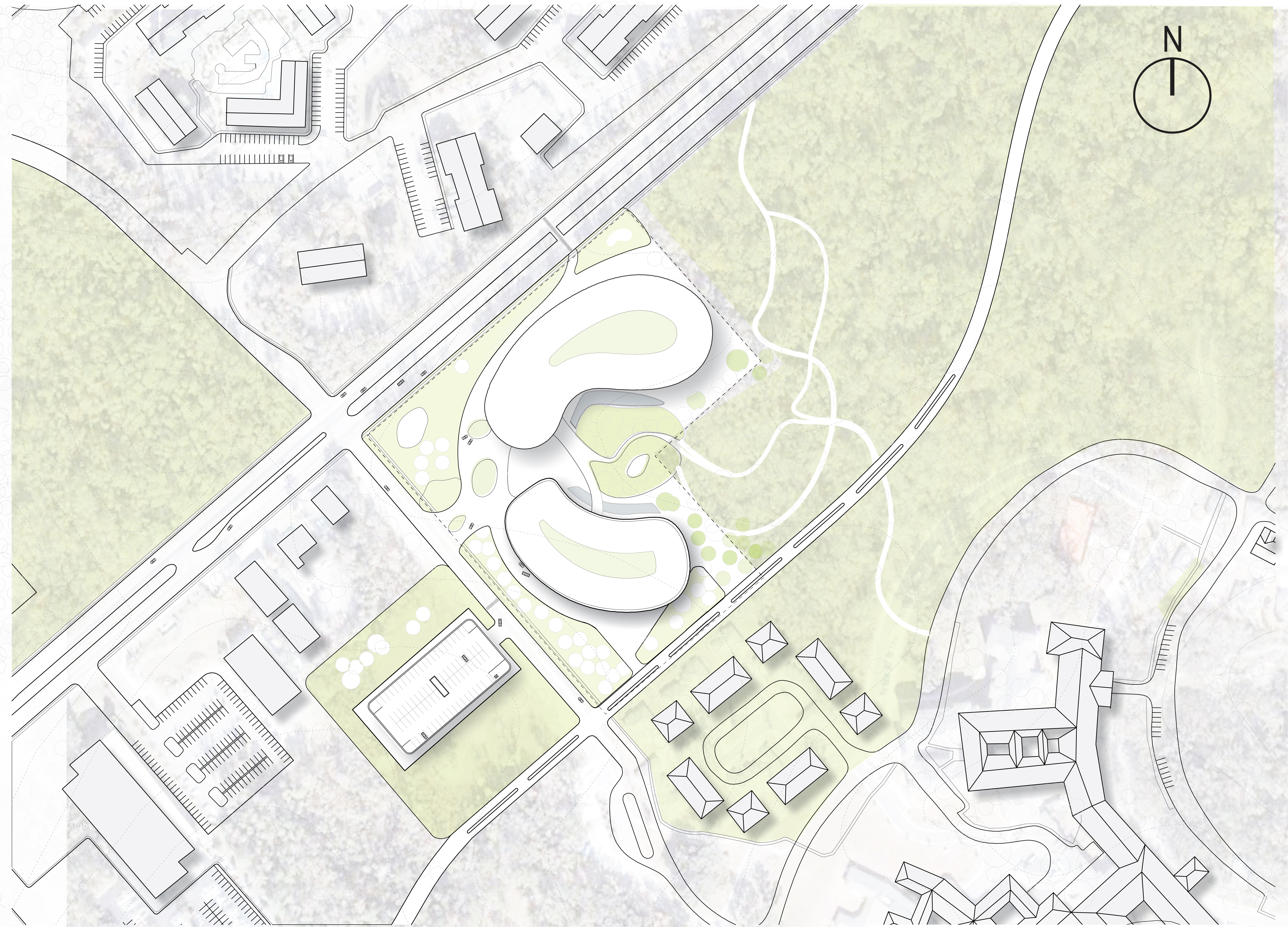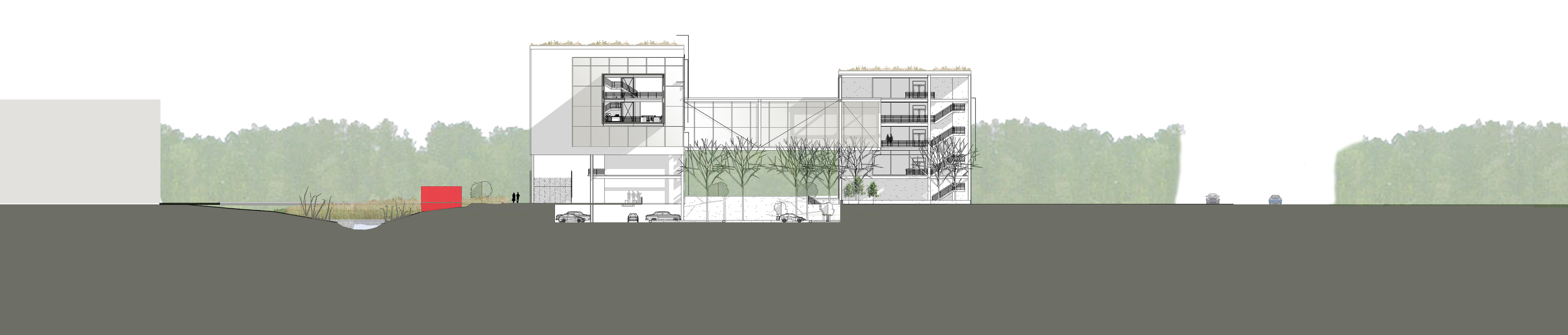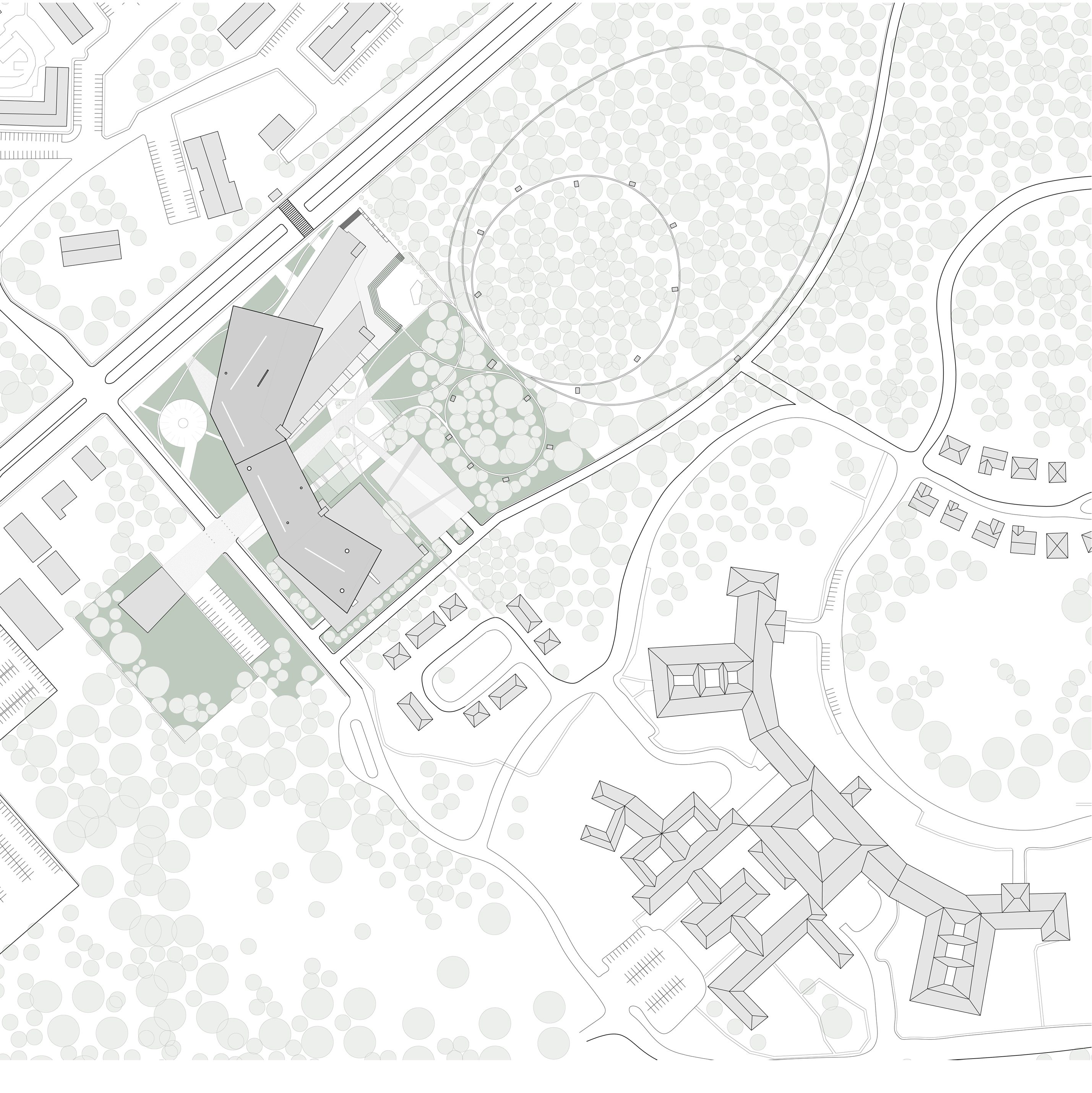 The site proposal retains most of the existing tree canopy coverage. Green Roofs: Improve stormwater management, insulation, and microclimate of the area.