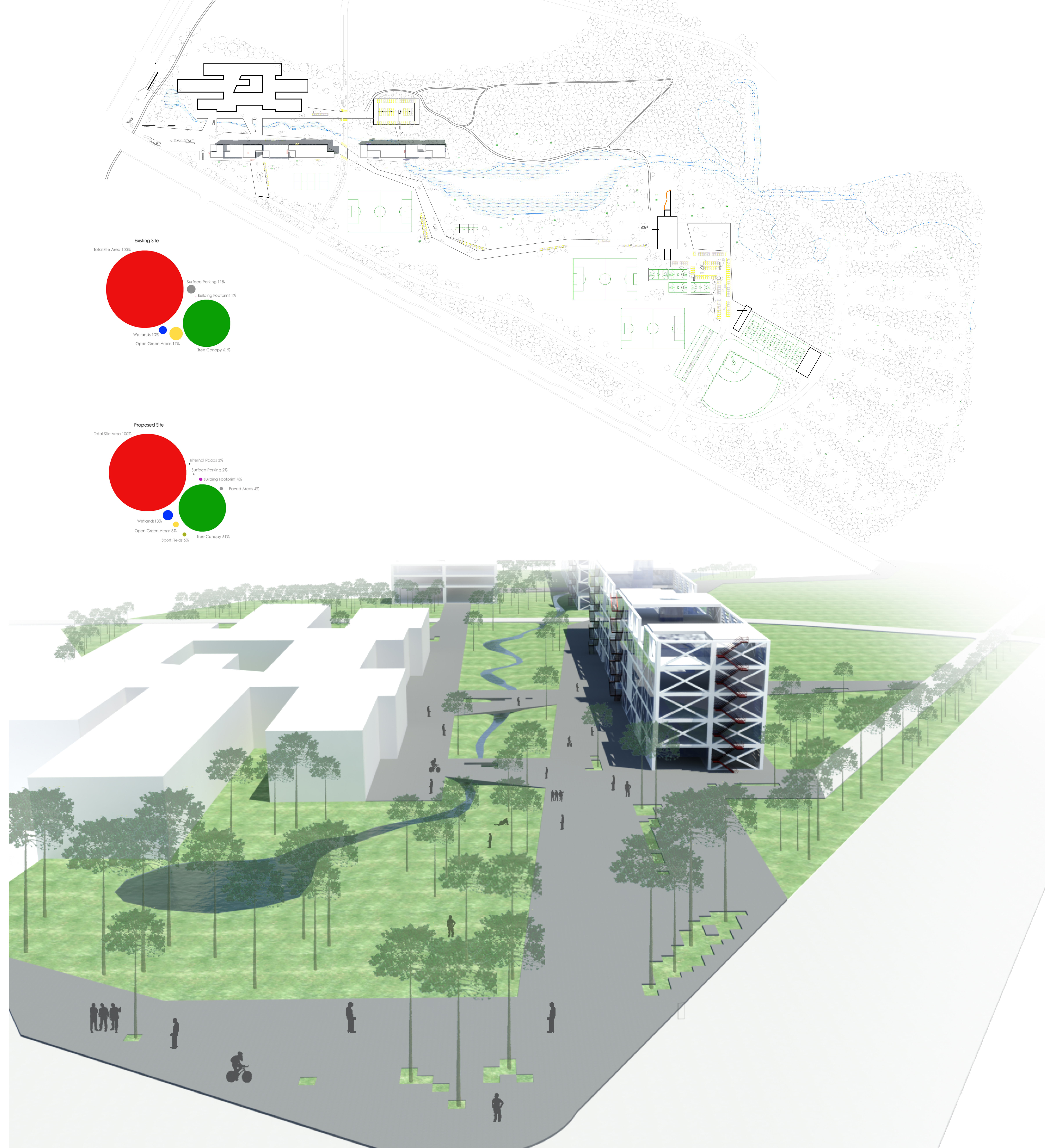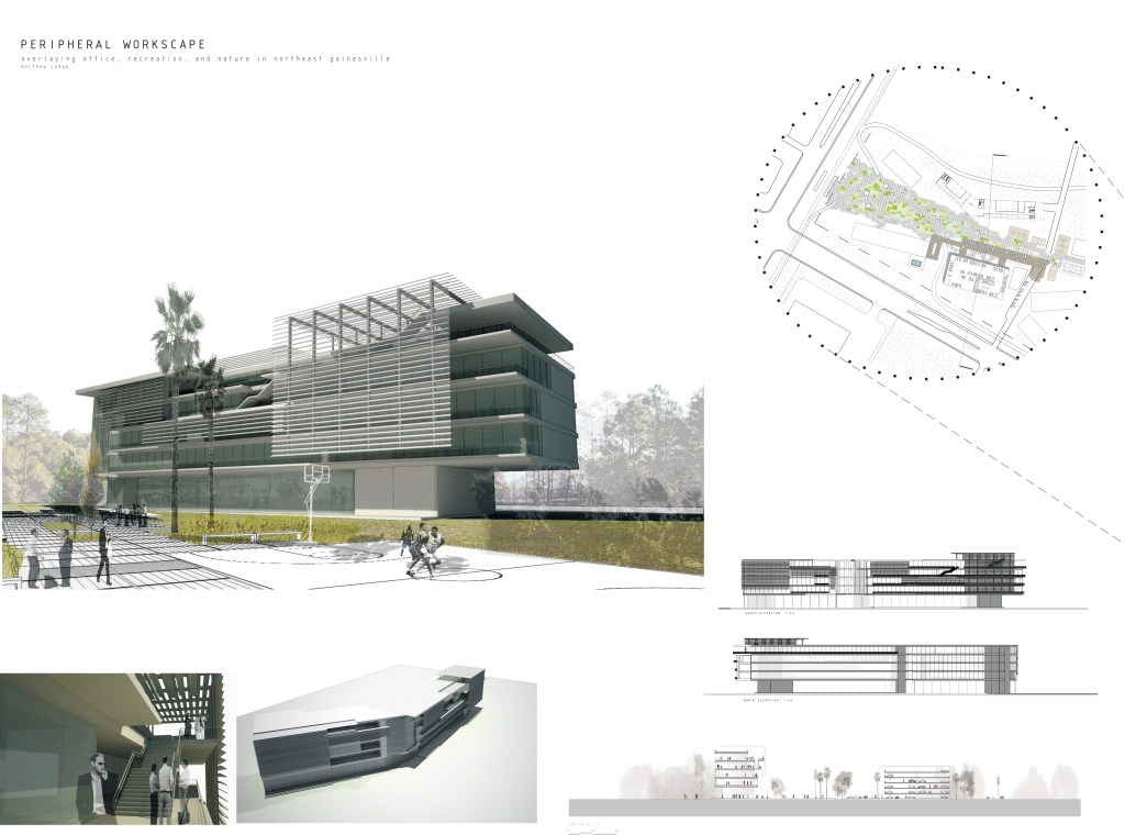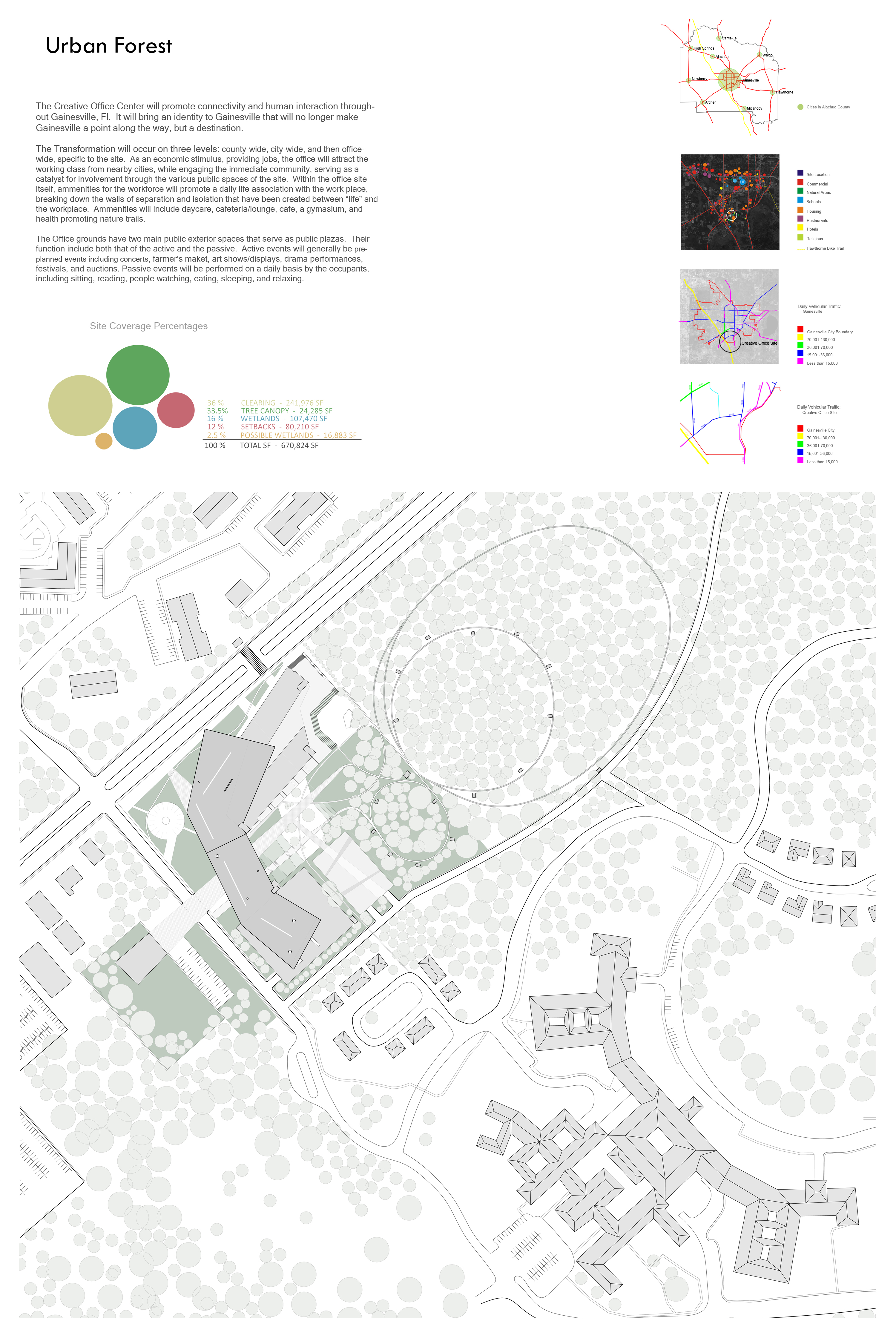 The Transformation will occur specific to the site on three levels and at three scales: county-wide, city-wide, and office-wide. As an economic stimulus, providing jobs, the office will attract the working class from nearby cities within Alachua county drawing a variety of people types to the site. The various public spaces of the site will serve as the catalyst for community involvement within Gainesville, with passive and active public functions. Within the office site itself, amenities for the workforce will promote a daily life associated with the workplace, breaking down the walls of separation and the isolation that has been created between “life” and the workplace. Amenities will include daycare, cafeteria/lounge, cafe, a gymnasium, and health-promoting nature trails.