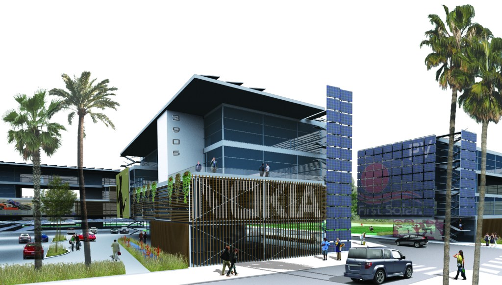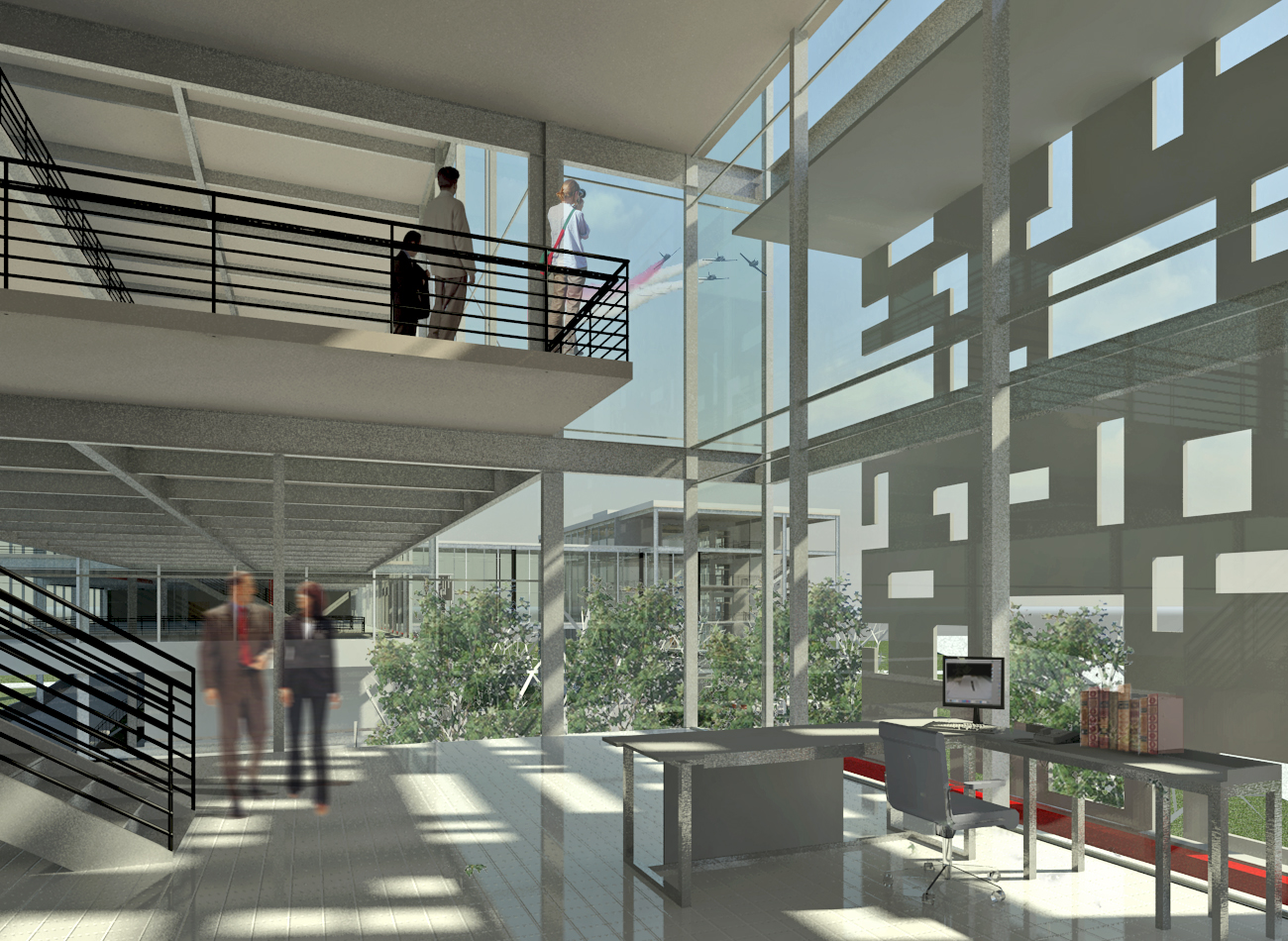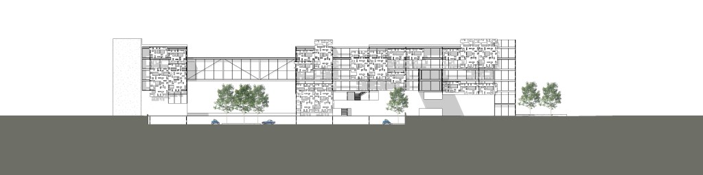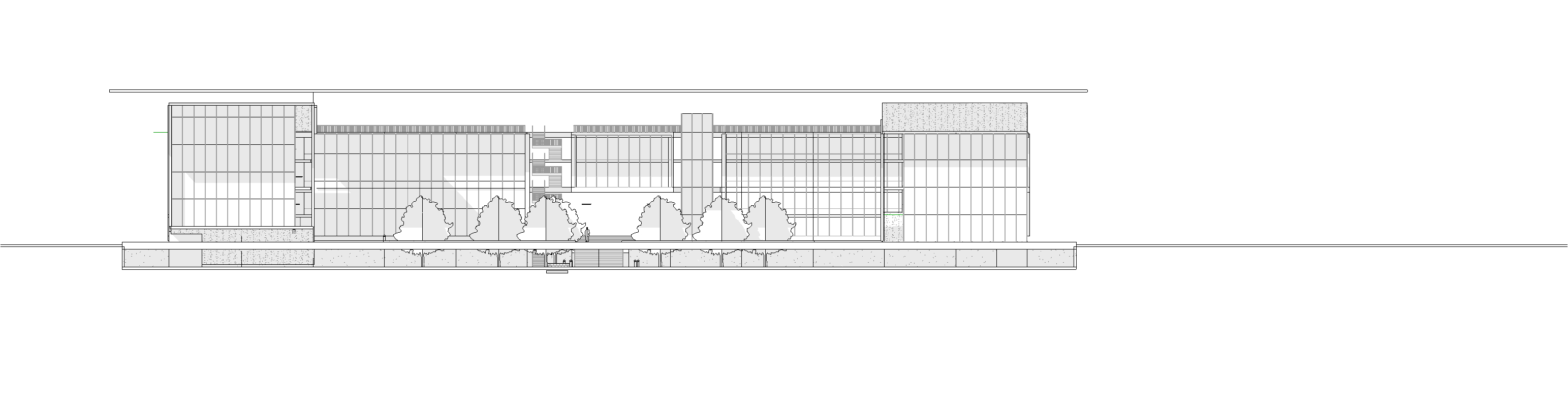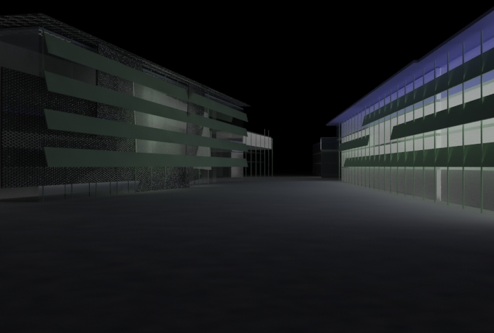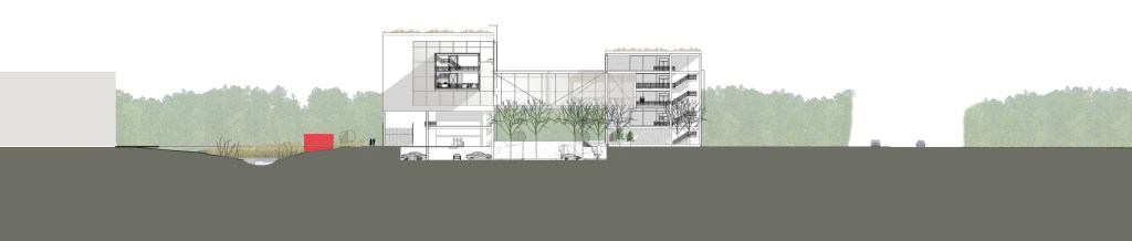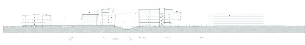 The façades express sustainable functionalism while making a rhythmic and flexible module of metal panels, solar panels, and windows with operable louvers. The solar panels are placed along the southern, eastern, and western facades of the buildings as well as the overhead condition of the atriums. Green roofs are on all buildings where water is filtered and collected into the onsite reflecting pools that provide irrigation to all the landscaping. Natural daylighting is integrated as lightwells throughout each building. The light is also used as a device to connect public spaces within the building.