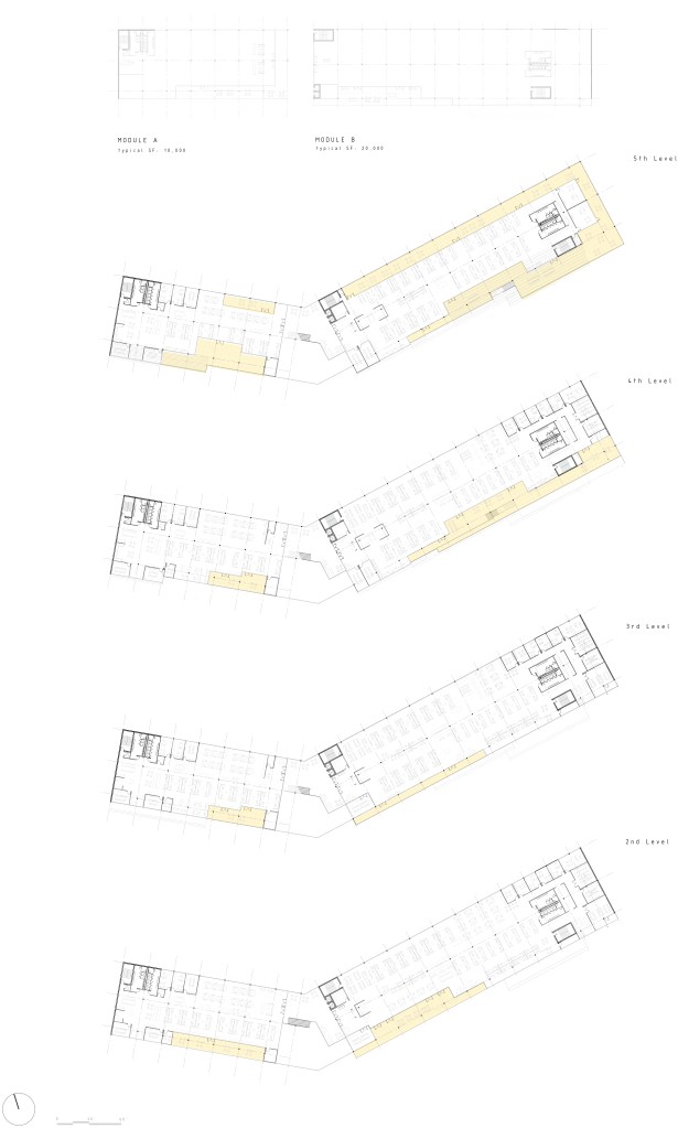 The layout of the individual buildings can be organized according to an orientation on the site as well as the personal preference of the intended occupying client. There is a variety of combinations that can be adopted. The modular arrangement of the square floor plates (2500 square feet) and rectangular floor plates (7500 square feet) provide an opportunity for exterior meeting areas or spaces used for lunch and breaks. Depending on the size of the inhabiting companies, several firms can co-exist in the same building.
