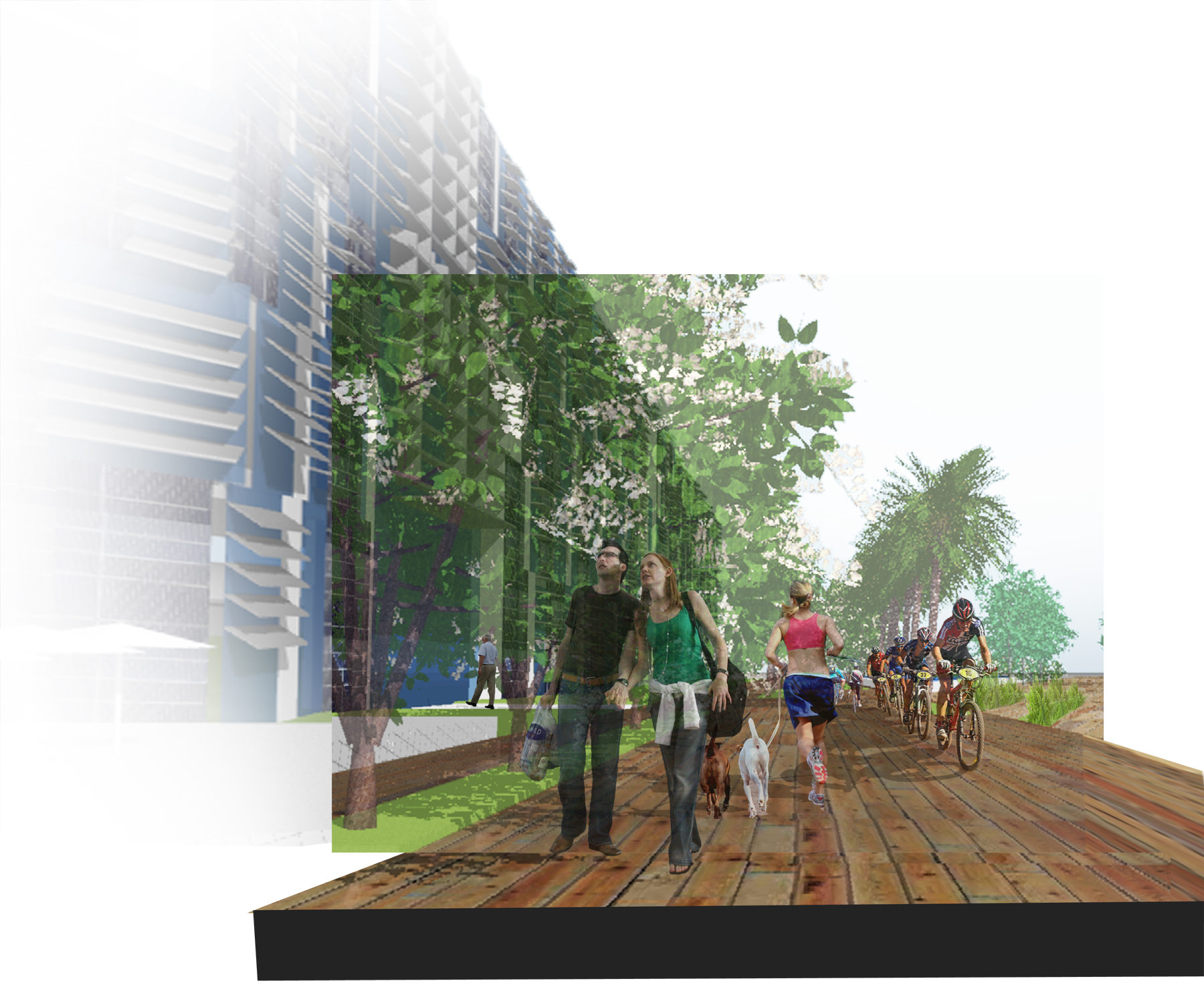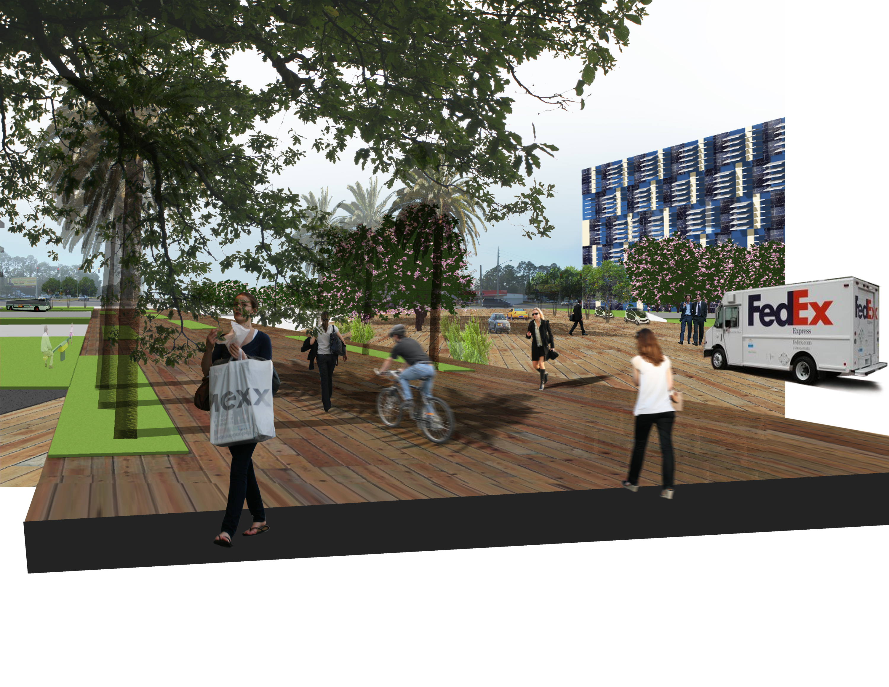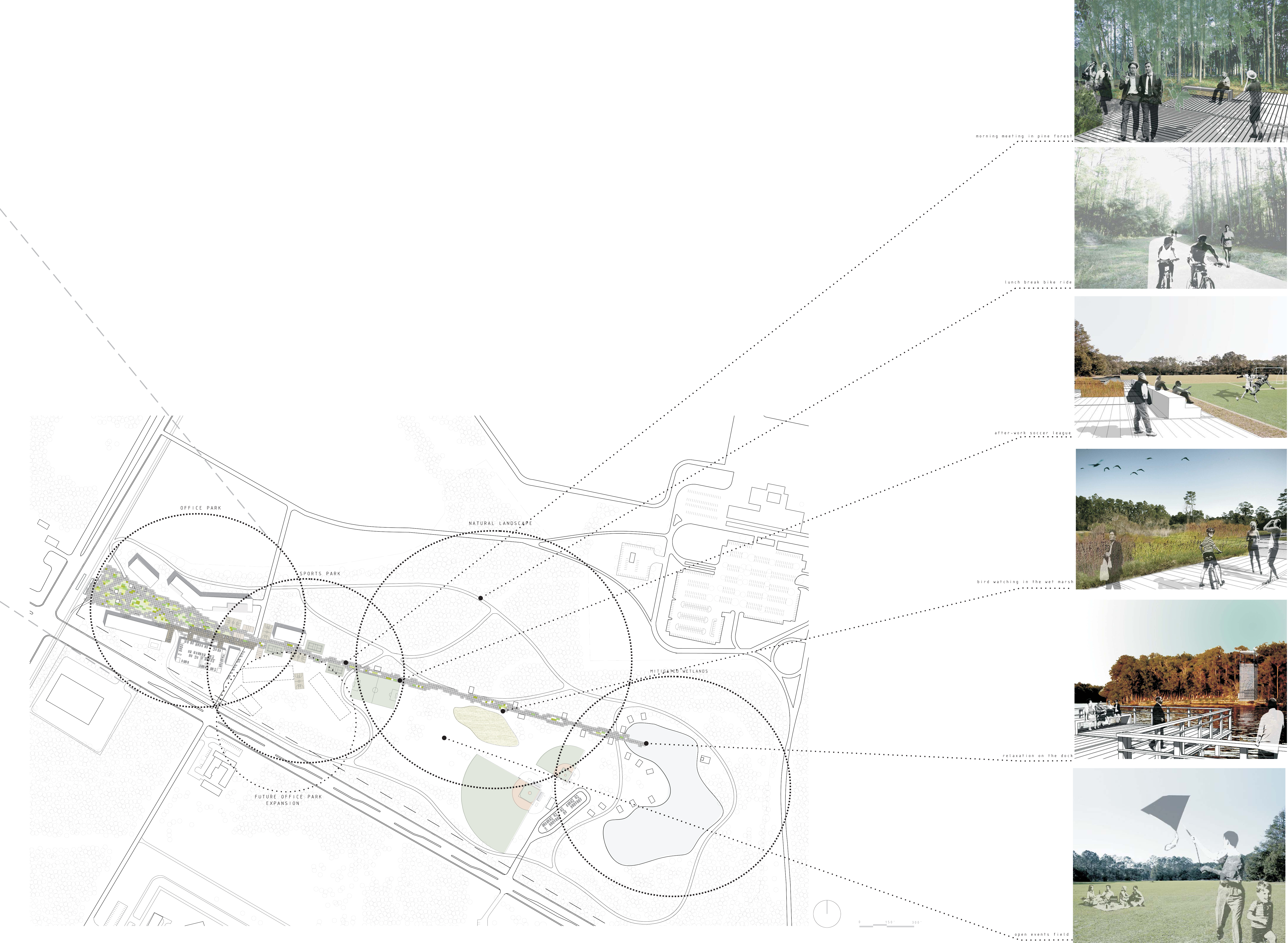 This transitional promenade becomes an amenity to east Gainesville, where new jobs, shops, sports facilities, bike paths, and parks can rejuvenate the area’s identity. Moreover, the promenade becomes an extension of the interior work scape to provide various exterior points where creative and innovative ideas are developed by reconnecting with nature: A marketing meeting in a pine forest; A lunchtime bike ride; A proposal-writing session on the dock.