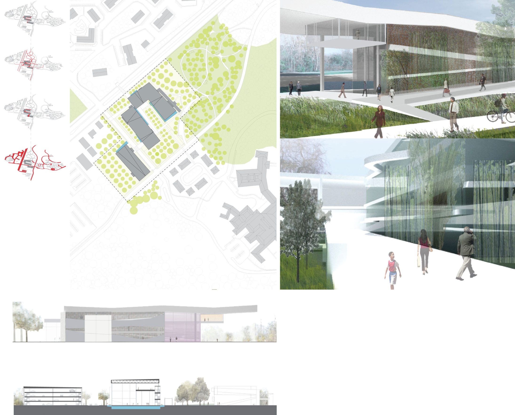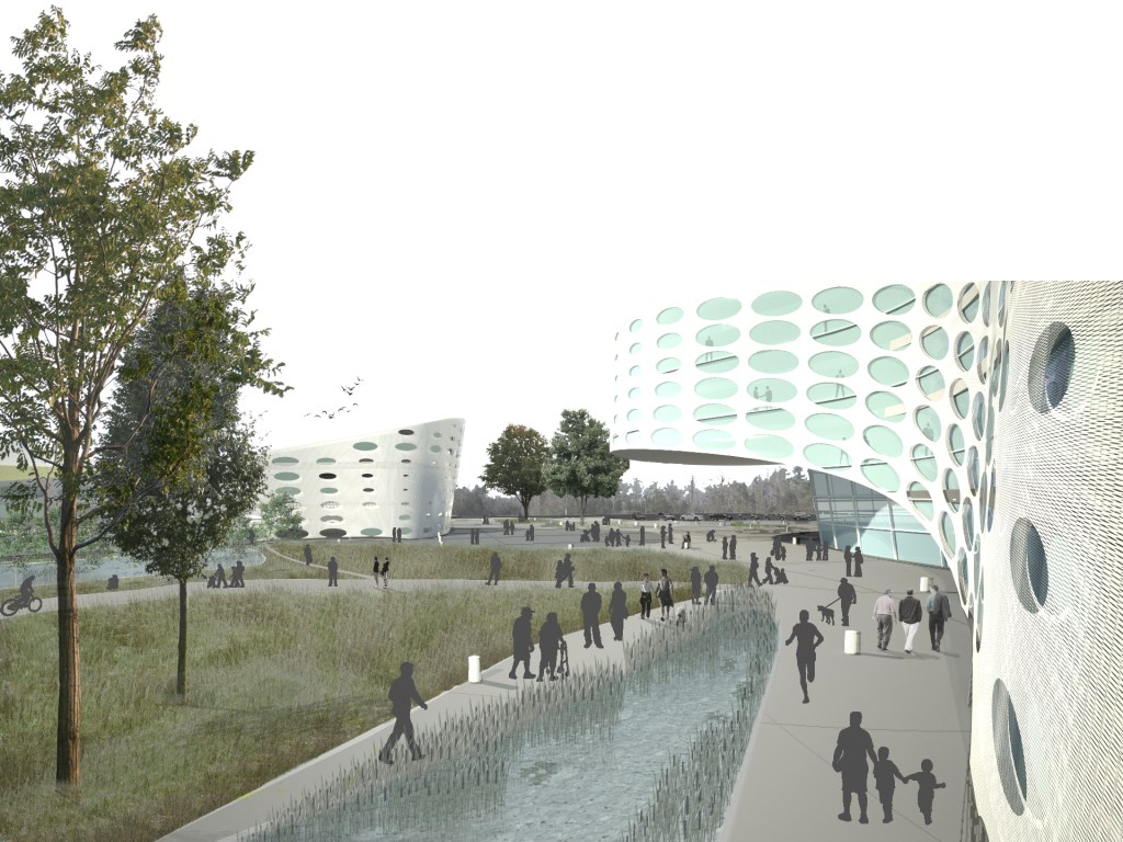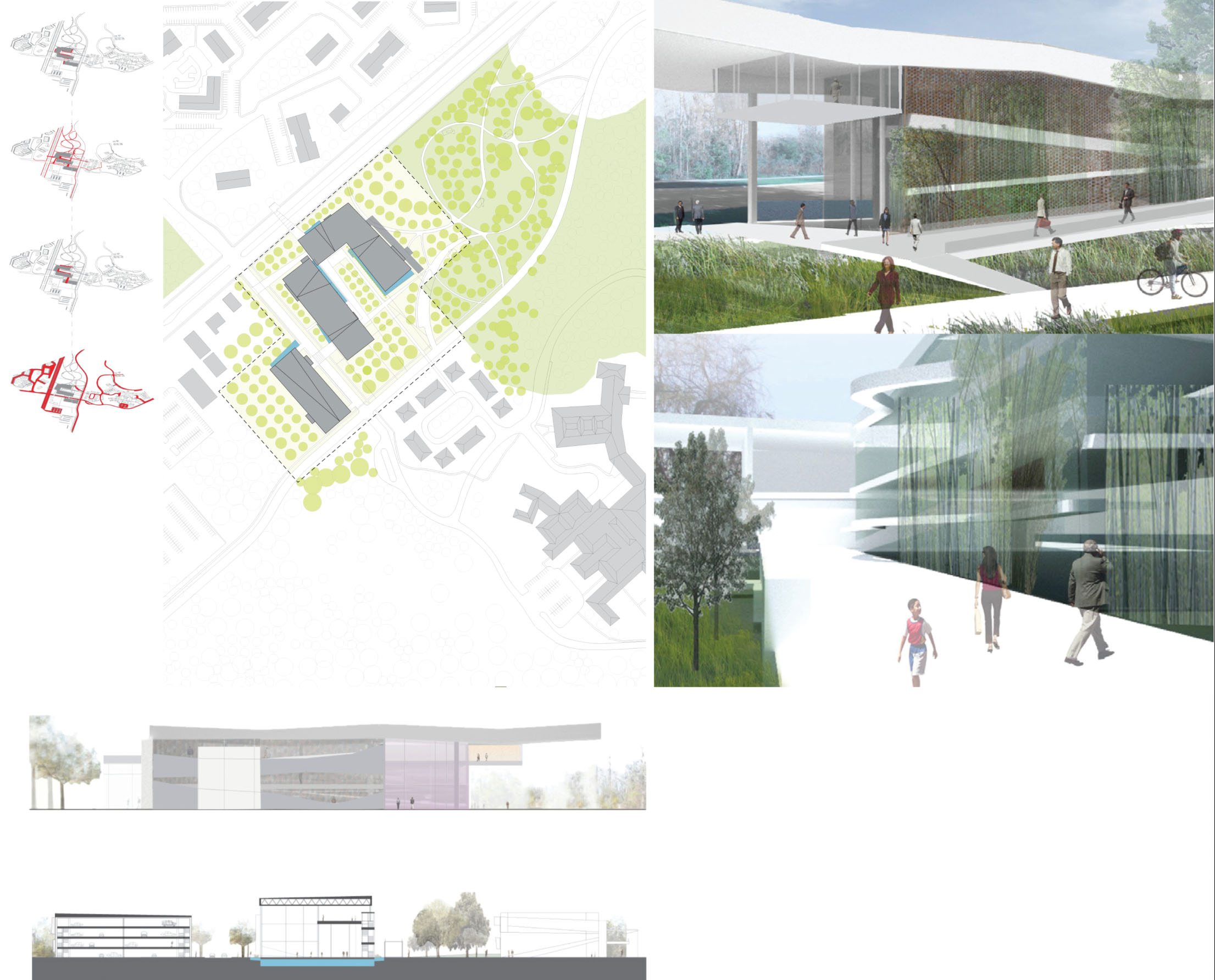 The ensemble of office buildings and intersecting promenades are the result of the need to minimize the building footprint by densifying the site on the street corner. Through density, the carbon footprint is reduced by lessening the need for the automobile. The promenades also offer more accessibility for pedestrians and bicyclists through different microclimates of vegetation, open fields, places to rest, and secondary plazas for socializing.