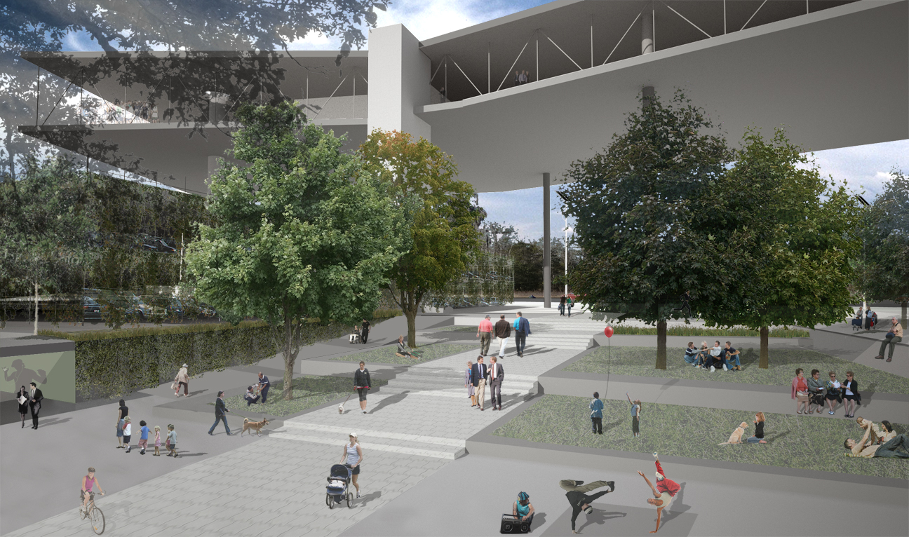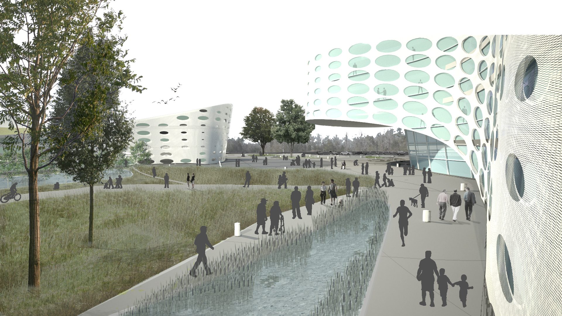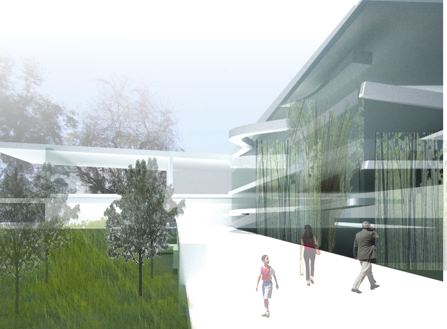 The ensemble of office buildings and intersecting promenades are the result of the need to minimize the building footprint by densifying the site on the street corner. Through density, the carbon footprint is reduced by lessening the need for the automobile. The promenades also offer more accessibility for pedestrians and bicyclists through different microclimates of vegetation, open fields, places to rest, and secondary plazas for socializing.