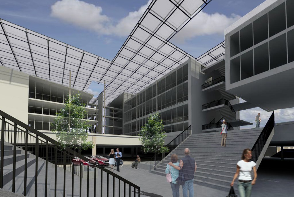 A series of parking garages are located underground, covering an area of more than 5 buildings. These garages provide enough parking spaces not only for the buildings above but for visitors and other buildings too. The main pedestrian entrance/exit to the garages is done through a 20 feet wide staircase, located strategically in the middle of the main plaza above.