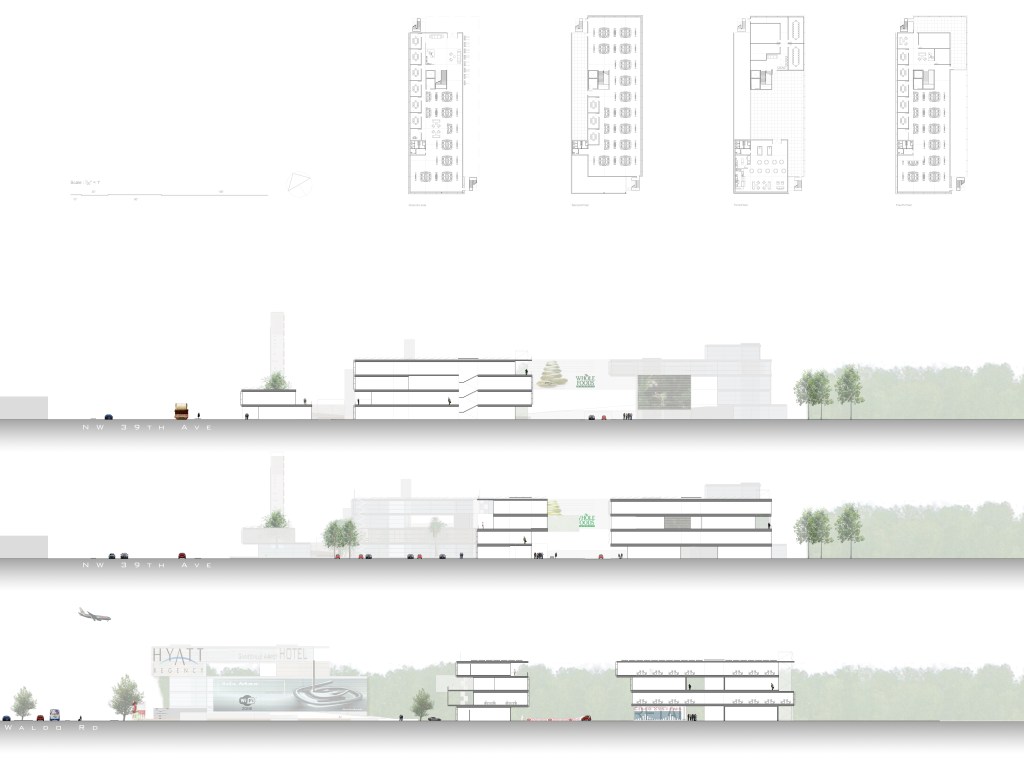 The idea of this design proposal is to create a center that offers office spaces, retail, and recreation parks. The programs interlock with each other, in a way to gives the area a feeling of community and a human scale. The design also deals with issues of transportation, parking, and weather conditions in Florida. Sidewalks, bike paths, bus stops, and streets for cars not only connect the buildings on the property but the adjacent areas as well. A new road, that cut the site in half, connects N.E. 39th street with the airport. Bike paths connect with the existing system and continue through the site into the wooded area.
