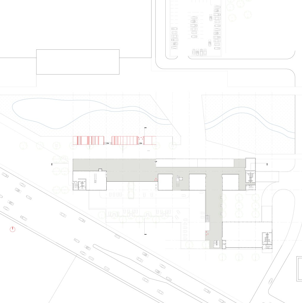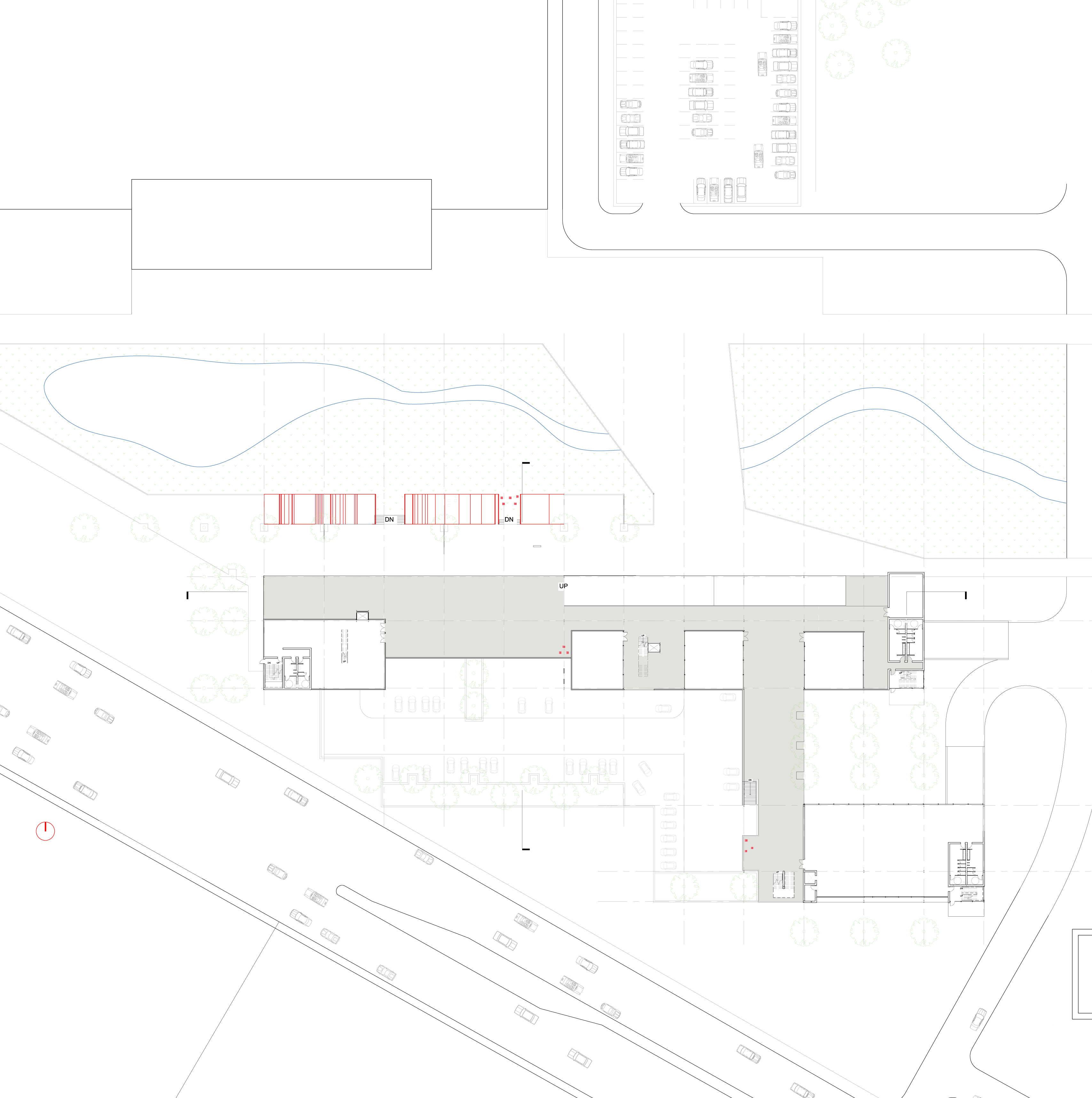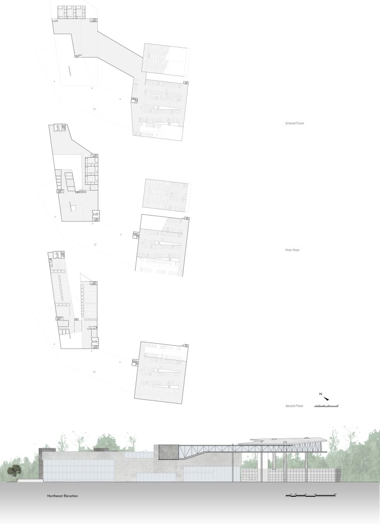 The project seeks to provide the city of Gainesville with a corporate park, and along with it, a place for community gathering. The site offers a varied landscape approach, ranging from shallow water features to green atriums and shade. The building form is a continuation of the green-scape and ecology surrounding the site, with the two office buildings acting as enclosures, protecting the interior courtyard spaces. Traffic enters through the main entrance on the east side of the site and is greeted by an overhang that houses the executive offices.
