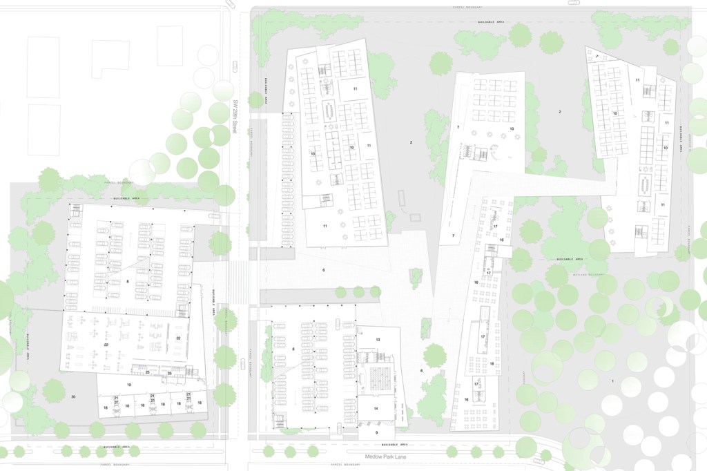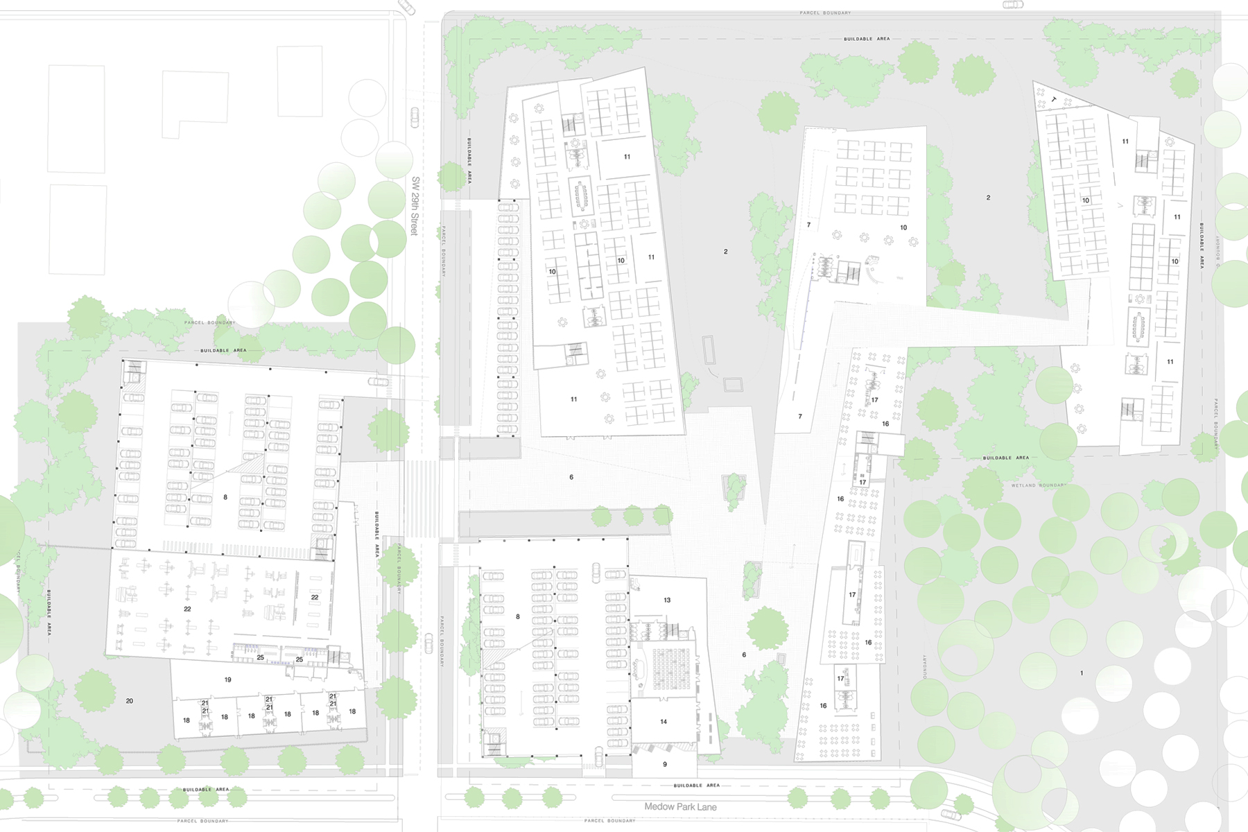 In facilitation of a creative culture work scape wherein the standard cubicle-dominated office, the plan is outmoded by an open and customizable interface whose multiple points of informal gathering and communication lead to the cross-pollination of ideas, a central plaza at the corner of Waldo Road and NE 39th Avenue is bounded by pivoting blocks of office, retail, hotel, and recreation to serve as a blended exterior zone where the paths of office workers, shoppers, bicyclists, hotel guests, and other pedestrians intermix.