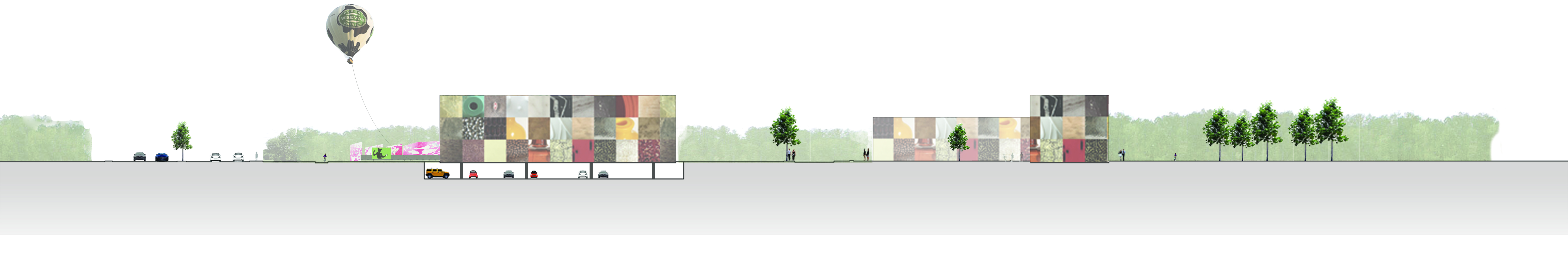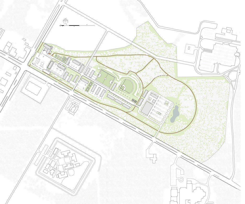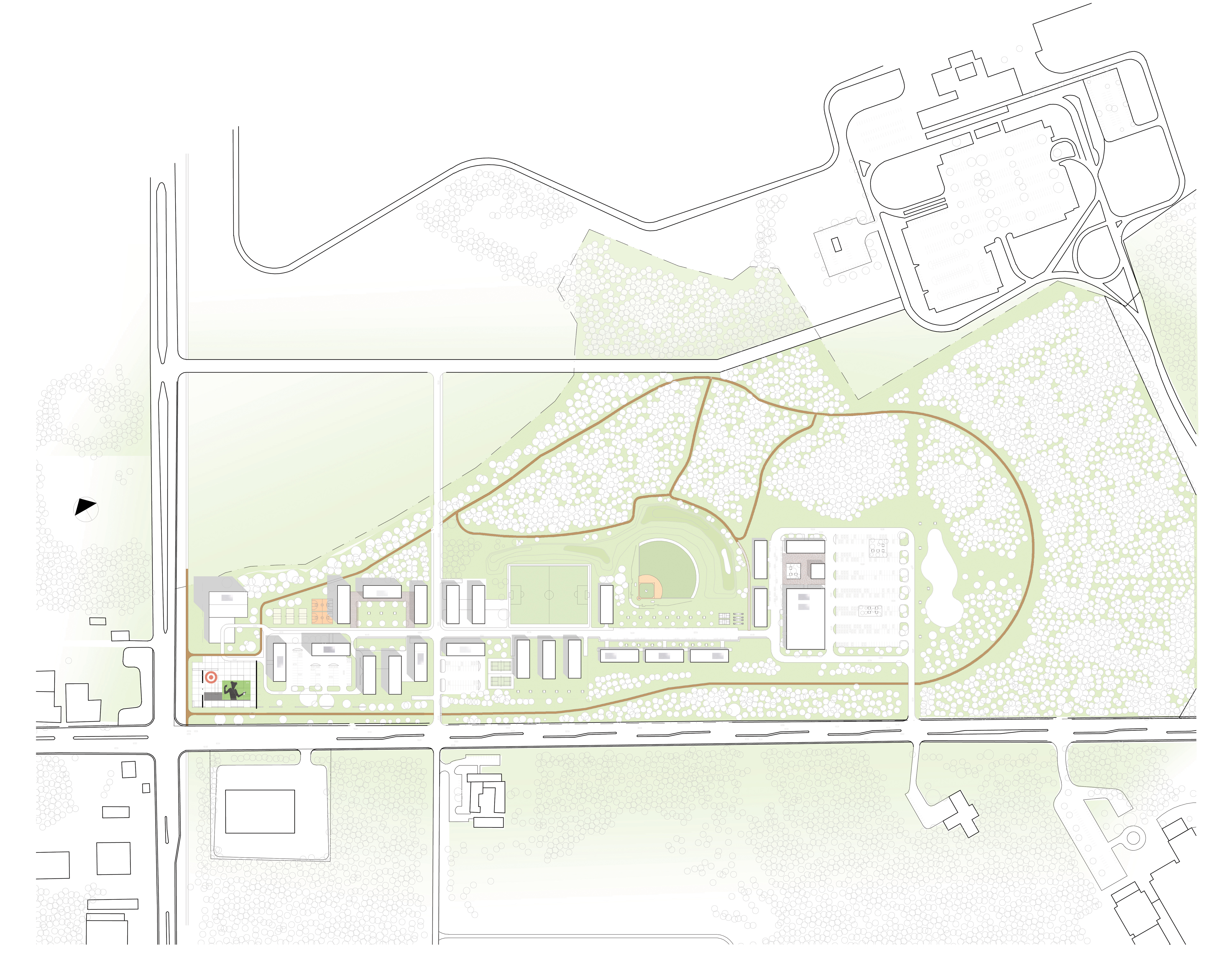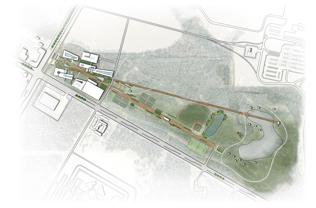The planning challenge was to offer increased accessibility for what the site will offer. This was done by creating two promenades that intersected at the heart of buildings: the Sports Promenade and Greenway. The Greenway connects bicyclists and pedestrians throughout the site to engage people in the park’s natural and untouched side. A transitional rhythm is made by native vegetation landscaped into the promenade. The rhythm causes people to shift in path and pace while leading in one direction. The second line of the axis, the Sports Promenade, is the path that connects the offices to the sports park. As one moves down the promenade, they are confronted by different sports fields such as basketball, volleyball, tennis, soccer, baseball, and racquetball.